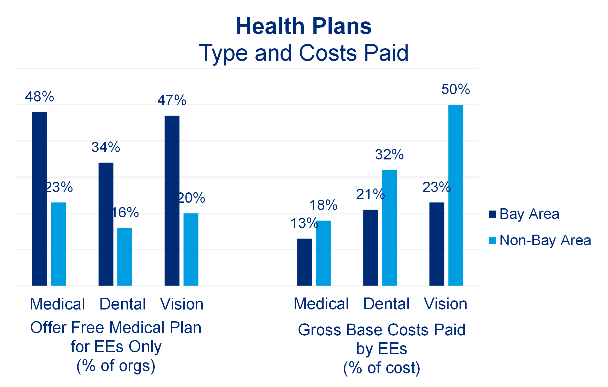 Cost sharing for health benefits is another area of Total Rewards where we see a difference between the coasts. When it comes to medical, dental, and vision plans, the Tech Total Rewards Survey indicates that Bay Area companies are more likely to offer “free” plans with no employee contributions for employee-only coverage and employees of Bay Area companies pay a lower portion of the gross healthcare costs. This approach reflects the competitive nature of the tech talent market in the Bay Area and addresses what employees value. Mercer’s 2024-2025 Inside Employees’ Minds Survey indicates that healthcare benefits are ranked as the #2 offering that attracts and retains employees at organizations within the Tech industry, and the broader market.