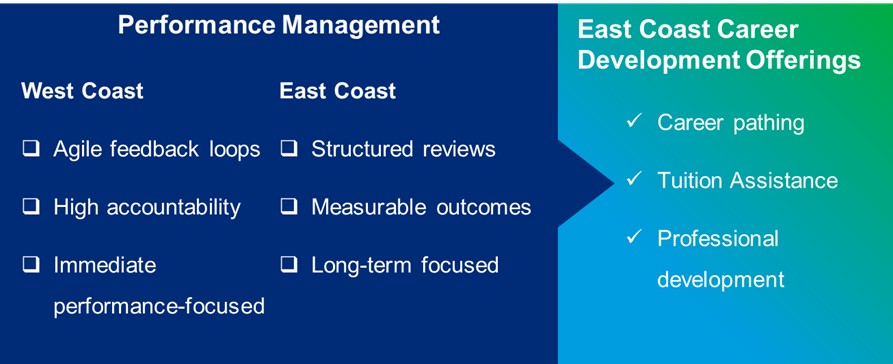 When it comes to long-term employee development, East Coast tech companies adopt a more structured approach compared to their West Coast counterparts. This difference is evident in both performance management and employee development practices, which reflect the distinct corporate cultures and strategic priorities of each region.
