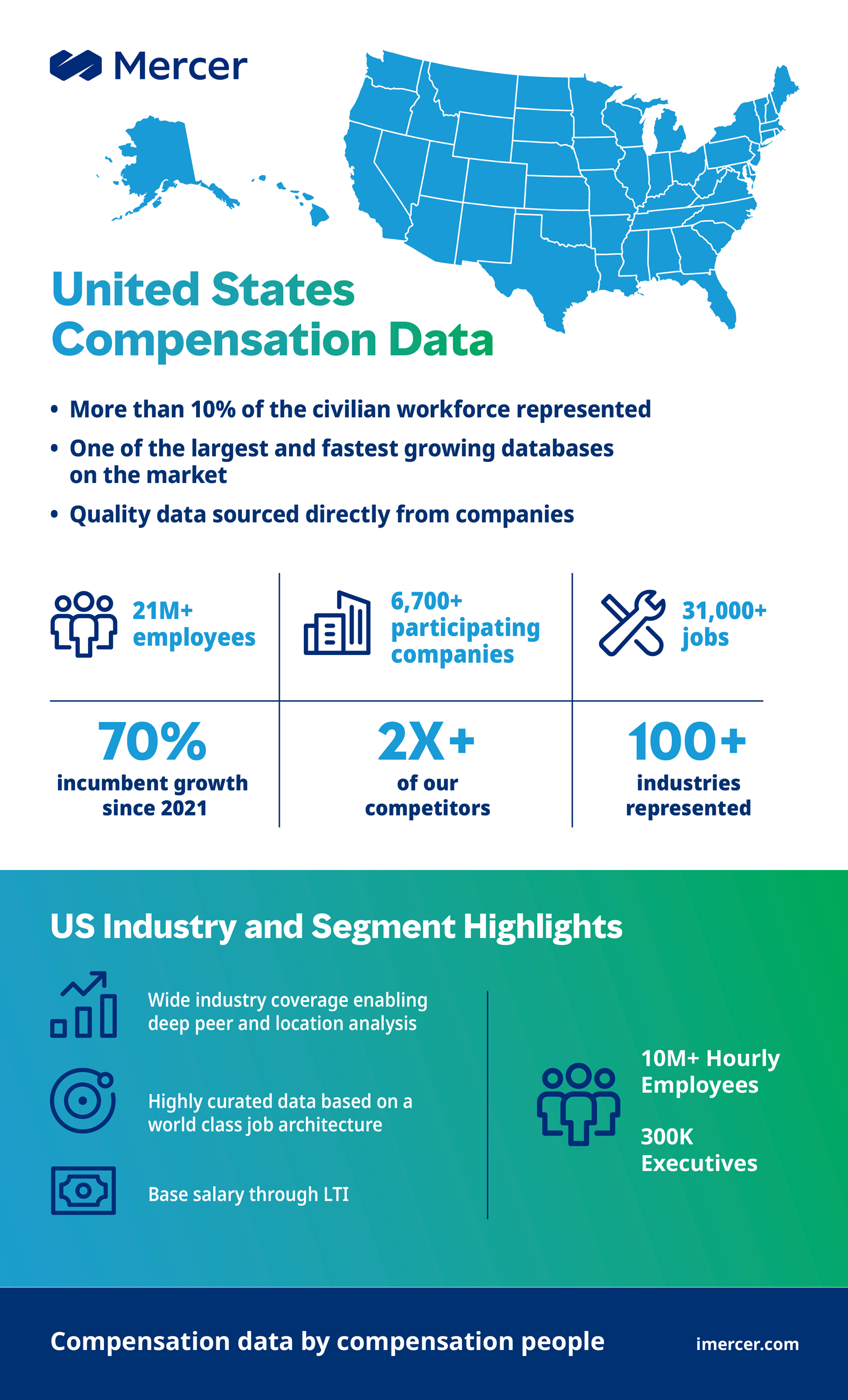 We pride ourselves on our industry expertise, quality data, and actionable insights which enable you to drive sustainable compensation practices tailored to your organization. Our highly regarded US compensation data provides organizations with reliable information to confidently manage pay in a constantly evolving and highly competitive labor market.