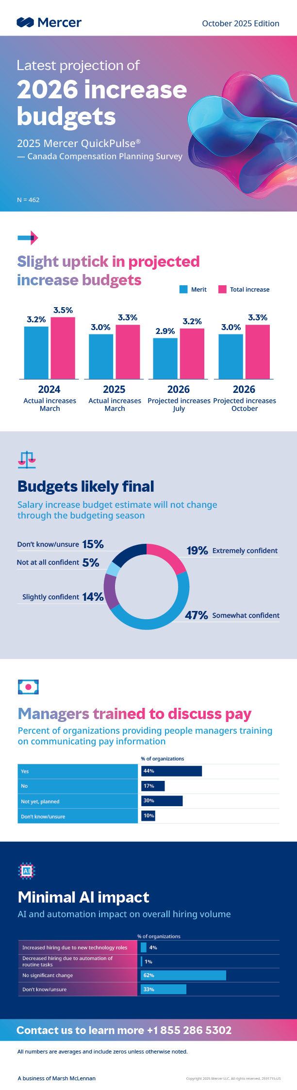In October 2025, 462 Canadian companies participated in the October edition of Mercer’s Canada Compensation Planning Survey about annual increase budgets, promotions, salary structure adjustments, and a variety of hot topics, including how companies are adjusting to AI.
